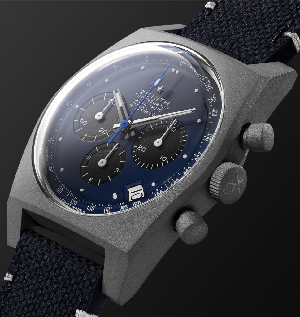 Cronaca spicciola a parte, l’appuntamento, come aveva spiegato Julien Tornare, CEO di Zenith, ha presentato la rinnovata collaborazione con Banford Watch Department che, dopo il Solar Blue, per il 50° anniversario del Primero ha portato a 50 esemplari dello Zenith A384 “customizzato”, o per meglio dire interpretato, da Banford Watch Department, anche con un nuovo nome: Edge of Space, messi in vendita solo sul canale e-commerce Mr.Potter. I collezionisti più ferrati avranno notato diverse fonti di ispirazione come la scala tachimetrica impiegata a metà anni ’80, la grafica o i contatori del decennio precedente che concorrono a dare al cronografo un’estetica vintage. Il cronografo (totalmente prodotto in house a Le Locle, sia pur in collaborazione con Bamford e mr.Potter) ha la cassa in titanio micropallinato con fondo a vista e reca incisi i numeri dell’edizione limitata, il quadrante blu ha contatori monocolore e indici bianchi.