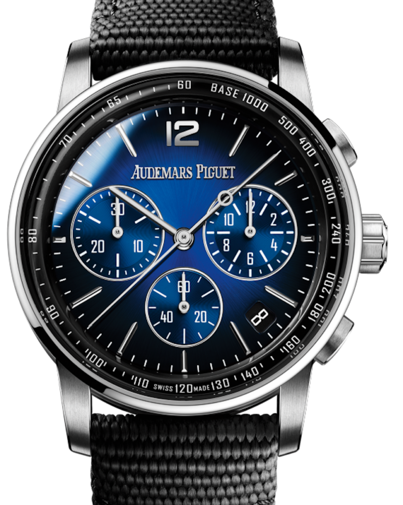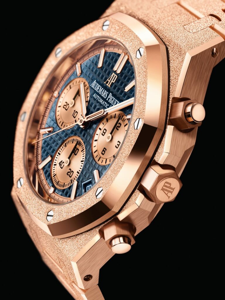Ed eccoci al Code 11.59, collezione lanciata nel 2019, che riunisce gli elementi che hanno distinto negli anni gli orologi AP. Sono nuovi un automatico e un cronografo automatico con cassa ø 41 mm in oro bianco e fondo in vetro zaffiro con quadrante laccato blu fumé, un colore impiegato per la prima volta l’anno scorso con la cassa in oro rosa.