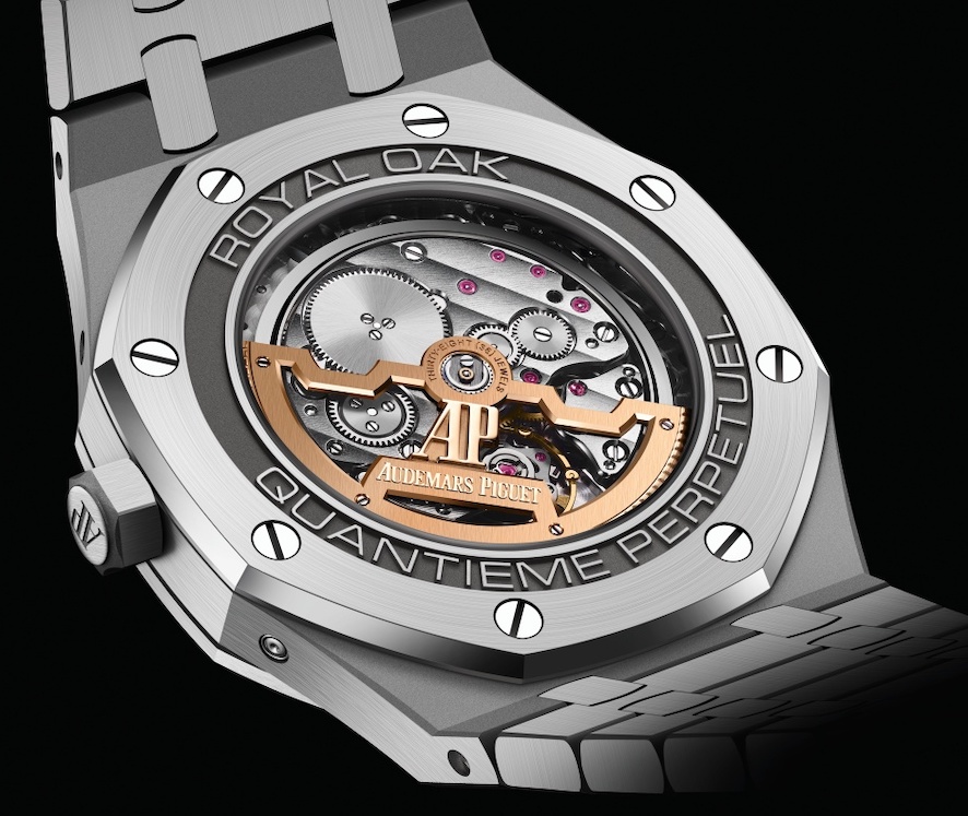 La nuova versione del Royal Oak con calendario perpetuo presenta la cassa ø 41 mm in titanio come il bracciale con fibbia pieghevole; dal fondello in vetro zaffiro si vede il Movimento automatico Cal.5134, composto da 374 elementi, 38 rubini, A/h19.800, riserva di carica 40 h.