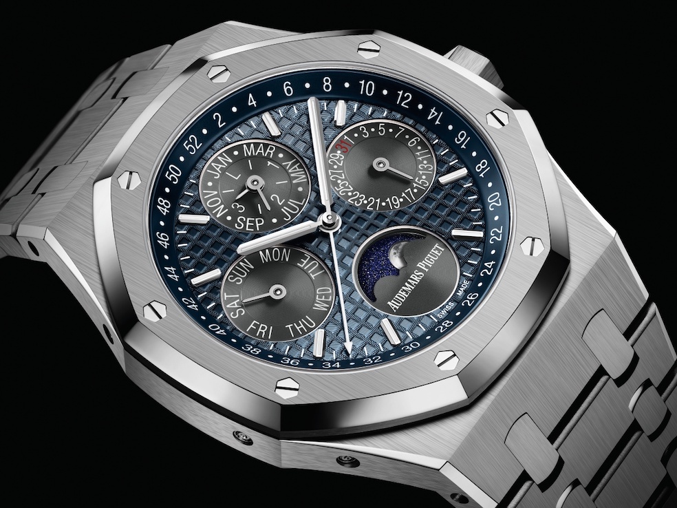 Il quadrante blu Grande Tapisserie ha contatori grigi, indici applicati e lancette Royal Oak in oro bianco con rivestimento luminescente e réhaut blu