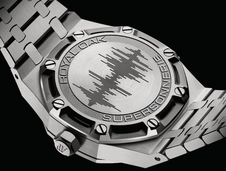 Con cassa, ø 42 mm in titanio come il bracciale e un raffinato quadrante grigio fumé modello Grande Tapisserie (indici e lancette in oro bianco e contatore piccoli secondi nero) questo Royal Oak Ripetizione Minuti è dotato della Supersoneria presentata come Royal Oak Concept al S.I.H.H. ginevrino del 2016 (soloPolso ne ha scritto il 14 Febbraio 2016) e anche in quella presentazione la cassa era stata scelta in titanio, lega che esalta il suono, con l’avvertenza che la sua estetica poteva essere soggetta a cambiamenti.