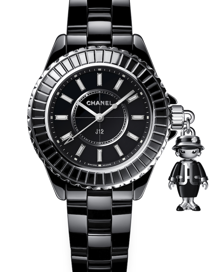 Appeso alla corona di due Chanel J12, in ceramica bianca o nera, ha fatto il suo ingresso un delizioso charms: stilizzata figurina di Mademoiselle Cocò, simbolo di eleganza e modernità per la platea sempre più vasta delle donne che amano gli orologi.