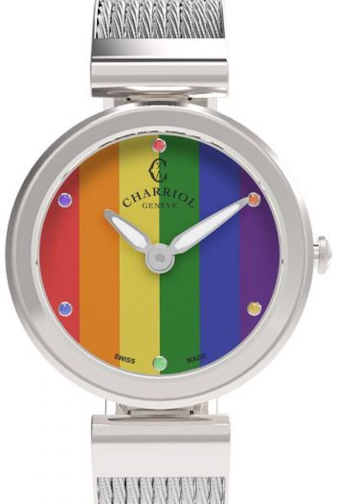 Tutto grazie al nuovo Forever Rainbow con ii quadrante illuminato da sei zirconi colorati e suddiviso in sei colori rosso, arancio giallo verde, blu e violetto il colore del Brand. La cassa ø 32 mm (ma è disponibile anche ø 40 mm) è in acciaio come il bracciale bangle. formato da sei cavi marinari, simbolo scelto sin dall’inizio della Charriol per gioielli e orologi; e si può indossare il segnatempo più o meno stretto sul polso. Il movimento è al quarzo svizzero.