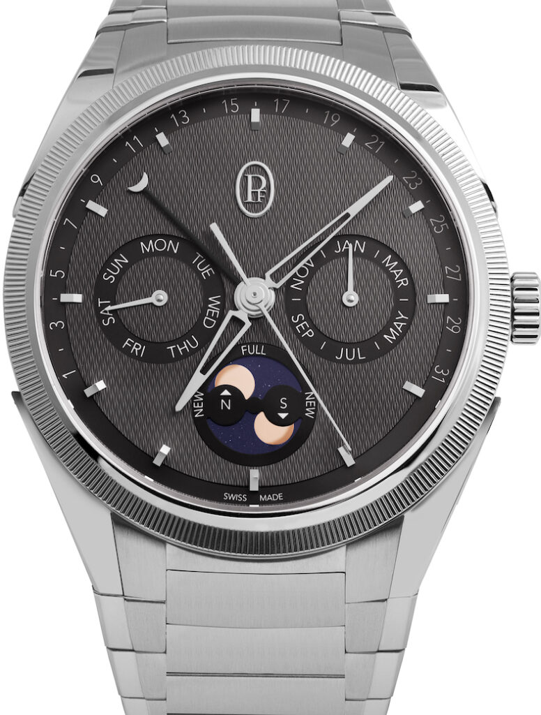 Seconda novità il Calendario annuale ø 42 mm, movimento Calibro PF339, ha la data a retrograde, l’indicazione di giorno mese e della luna vista dai due emisferi (solo dopo 122 anni bisogna correggerne l’indicazione), il quadrane è grigio opaco.