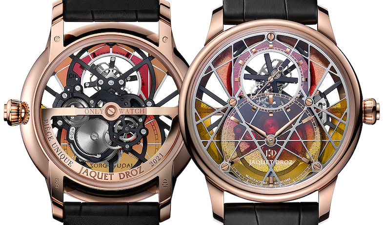 Il Grande Seconde Skelet-One Tourbillon ha la cassa in oro rosa ø 41 mm, il quadrante plique-à-jour, è stato diviso in settori delimitati da fili di oro bianco e poi dipinti con smalti policromi, lucidati con finissima polvere di diamante, che hanno ripreso, in diverse tonalità i colori di Only Watch 2021. L’estetica è moderna ed altrettanto attuale la scelta di alcuni componenti del movimento in silicio. come la spirale e le anse dell’ancora. La finestrella del Tourbillon è a ore 12, e si pone simmetrica all’ampia sezione dove leggere ore e minuti, mentre i piccoli secondi appaiono sul tourbillon.