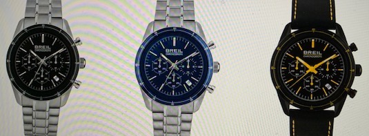 Sono tre invece i modelli destinati ai polsi maschili, con cassa ø 42 mm w.r. a m.100, IP lucido e fondo a vite, vetro con effetto bombato, lunetta in alluminio nera o blu con scala tachimetrica, quadrante satinato con contatori tono su tono o con dettagli gialli. Due versioni sono completate dal bracciale in metallo bilux e uno dal classico cinturino con cuciture gialle; per tutti il movimento è il Calibro al quarzo TMI VD53.
