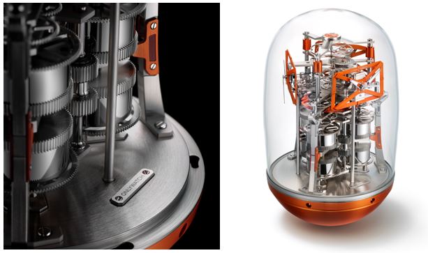 A sorpresa Ulysse Nardin ha optato per un orologio da tavolo, in collaborazione con l’Epée. Si chiama Ufo il cronometro da marina presentato in primavera in versione blu e in edizione limitata a una settantina di esemplari per celebrare il 175° anniversario della Maison di Le Locle. La versione per Only Watch è invece in una brillante tonalità tonalità arancione. I cronometri da Marina del passato erano fissati su giunti cardanici, questo ha una base emisferica che contiene una massa di tungsteno così, spingendolo delicatamente, l’oscillazione ricorda il rollio delle navi; Ufo pesa Kg 7,2 e oscilla fino a 60° rispetto al suo asse – un’ampiezza di 120 gradi. Il movimento viene caricato con una sola chiave da inserire nei tre quadranti trapezoidali che consentono di vedere l’ora su tre fusi orari, bastano 40 giri per avere una carica che, grazie a sei bariletti dura per un anno.