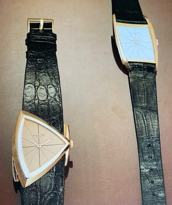 La Marca ginevrina è sempre stata molto classica nelle sue scelte (Il Nautilus, nato dopo il successo del Royal Oak, trovò subito l’approvazione di Philippe Stern, ma anche un’accanita opposizione interna, comunque ogni regola ha la sua eccezione e quelli che ricordavamo erano orologi che uscivano dagli schemi; in qualche caso si potevano tranquillamente definire asimmetrici, anche se – secondo la Treccani – asimmetrica è una forma che manca di armonica corrispondenza fra le parti; però a questo punto, pensando alla musica, si può arrivare alle dissonanze armoniche entrando in un discorso difficile da concludere. Così tornando agli orologi originali per la forma, ho preso in biblioteca i due libri che ricordavo: “Patek Philippe orologi da polso” di Martin Huber e Alan Banbery in collaborazione con Gisbert L.Brunner, edito da Antiquorum e il catalogo che Antiquorum pubblicò nel 1989 per l’asta “L’Arte di Patek Philippe” che si tenne all’Hotel des BergUes a Ginevra il 9 aprile 1989.