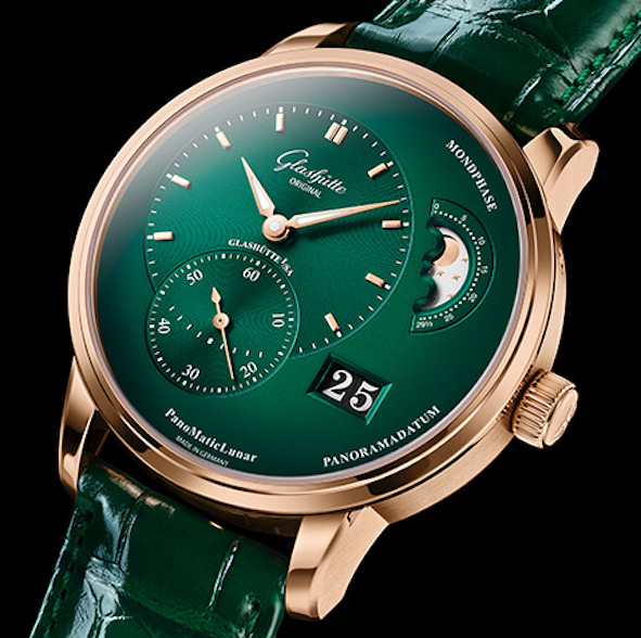 Glashuette Original per il suo nuovo Panomatic Lunar Forest Green ha scelto un verde che ricorda i boschi di conifere della Sassonia 3 che viene realizzato spruzzando lacca nera sul bordo esterno del quadrante per ottenere un effetto degradante, passando poi alla laccatura verde. Simmetrica la data e la finestrella della luna, la cassa ø 40 mm è in oro o in acciaio e dal fondo in vetro zaffiro mostra il Calibro automatico di Manifattura 90-02.