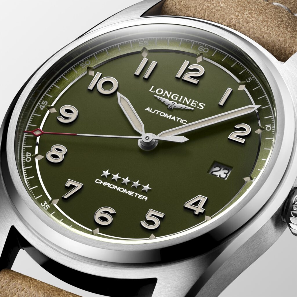 Recentemente Longines ha scelto un nuovo quadrante verde nella collezione Spirit che sino ad oggi proponeva il blu dell’aviazione. Il nuovo automatico nella cassa ø 40 mm in acciaio inossidabile satinata e lucida, accoglie il movimento Calibro L888.4 con spirale in silicio e certificazione COSC; il quadrante verde microbillé (secondo noi un verde oliva scuro) ha indici arabi e lancette rodiate sabbiate rivestite con Super-LumiNova®; è disponibile con cinturino o con bracciale in acciaio.