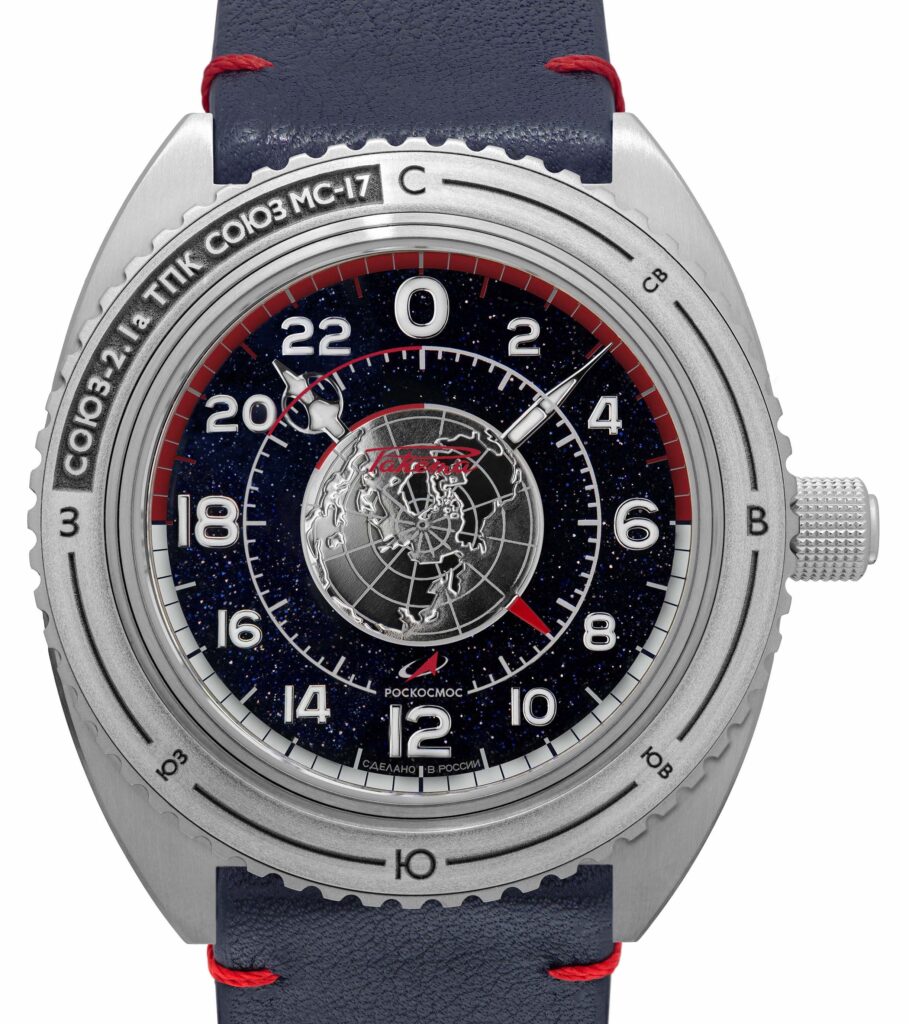 Infatti in questo 24 Ore che sul quadrante mostra il nostro pianeta, e che è stato realizzato in collaborazione con l’Agenzia spaziale russa “Roscosmos”. la lunetta è stata fabbricata partendo da un frammento di metallo della Sojuz2 lanciata nello spazio il 14.10.2020 (con rientro sulla terra dopo tre ore) mentre peri cinturino si è ricorsi al tessuto della tuta spaziale Sokol; i cosmonauti russi Sergey Ryzhikov e Sergey Koud-Skvertchkov, che hanno collaborato a questa produzione, hanno insistito perché il movimento mostrasse le 24 ore, durante le loro missioni ogni 24 ore hanno visto 16 albe e altrettanti tramonti, quindi un orologio che faccia capire se è giorno o notte è utilissimo. Certificato dall’Agenzia spaziale russa, l’orologio ha un robusto movimento automatico, Calibro 2426A (24 rubini 40 h, 18.000 A/h) sviluppato negli anni ’60, cassa in acciaio 43 mm w.r. a 20 ATM, lunetta girevole, vetro zaffiro e vetro minerale sul fondo).