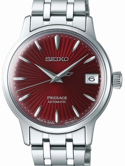 Nella collezione Presage Cocktail torna un segnatempo automatico (Calibro 4R35, carica 41 h, 23 rubini, A/h 21,600) o a richiesta a carica manuale, sempre con un quadrante dedicato al 14 Febbraio visto che ha un fondo elegantemente lavorato nella tonalità più adatta agli innamorati, il rosso. Gli indici sottili sembra siano stati ispirati dagli steli dei calici, il colore lucido viene steso sette volte su un fondo lavorato a raggi di sole e sembra sia stato scelto perché simile al Kir Royal, uno dei tanti cocktail ideati a Tokyo da Hisashi Kishi, bartender e proprietario dello Star, uno dei Bar più noti a Gynza. La cassa in acciaio ø 33,8 mm ha il fondo a vista per lasciar vedere il movimento, una scelta che appaga il gusto di molti consumatori europei.
