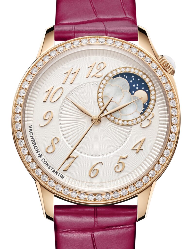 Nella collezione Egerie, che la Maison ginevrina propose dal lontano 2003, sia pure allora con forme curve che si traducevano in casse ovali e oggi con le più tradizionali casse rotonda che però nelle curve occhieggia ancora all’ovale, si fondono l’eccellenza orologiera e l’eleganza della Haute Couture con un quadrante che riprende la leggerezza dei serici tessuti plissé. Alla carica automatica (Calibro di Manifattura 1088 L, 28,800 A/h, 26 rubini), è stata aggiunta la complicazione della luna realizzata in oro su un disco stellato, con nuvole in mareperla, in un anello in oro rosa con 36 diamanti. L’Egerie fasi d luna ha una cassa ø 37 mm, in oro rosa o in acciaio con bracciale analogo e fondo in vetro zaffiro, sulla corona ha una pietra di luna a cabochon, lunetta con 58 diamanti per un totale di circa un carato, quadrante opalino argentato e indici in ora rosa o bianco applicati; la versione con la sola data ha un diametro più contenuto, mm.35,
