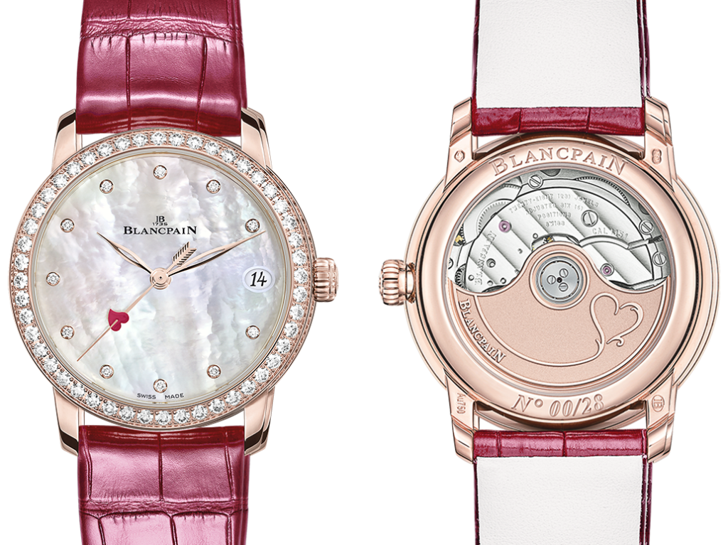 DaL 2001 Blancpain è fedele a un modello per il Valentine Day pur variandone alcuni particolari. Sotto il profilo estetico c’è sempre un cuore rosso che si affianca alla preziosità dei diamanti; quest’anno la cassa di oro rosso ø 33,2 mm, accoglie il Calibro Blancpain 1151 a carica automatica, derivato dal Calibro 1150 e che è dotato di spirale in silicio, ha una riserva di marcia di quattro giorni e offre l’indicazione della data. Il movimento è visibile dal fondo in vero zaffiro e si può ammirarne facilmente la bella decorazione. Gli esemplari sono 28. Infine un ricordo storico, il primo orologio Blancpain femminile a carica automatica nacque nel 1930 e tre anni più tardi la Maison, dopo la morte dell’ultimo erede diretto del fondatore, fu guidata con mano ferma proprio da una donna: Betty Fiechter.