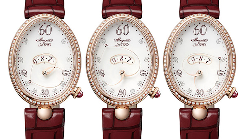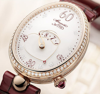 Nella collezione Reine de Naples sono riuniti ormai da diversi anni splendidi orologi femminili che hanno saputo interpretare momenti diversi nei quali ornare i polsi di poche donne fortunate. Per San Valentino 2021 il modello Coeur presenta un aspetto inedito, la lancetta dei minuti (protetta da una serie di brevetti) è composta da due parti che formano un cuore e che si muovono con velocità diverse impresse dal movimento il Calibro 78A0, seguendo il quadrante ovale allungato e cambiando la forma del cuore per indicare con la punta i minuti; le ore appaiono dal disco della finestrella centrale. Nella foto sotto le immagini di quanto abbiamo appena descritto. Sul quadrante in zaffiro laccato bianco, per ottenere un effetto traslucido, dettagli rossi a forma di cuoricini segnano i cinque minuti, mentre sono in numeri arabi le cifre ai quarti; la finestrella delle ore a forma di goccia, ha un filo di contorno in oro rosa e i numeri arabi sono in lacca rossa; la lunetta e il réhaut sono impreziositi da 128 diamanti, la cassa è in oro rosa come la corona sulla quale è incastonato un rubino; il fondo è a vista per mostrare il movimento meccanico.