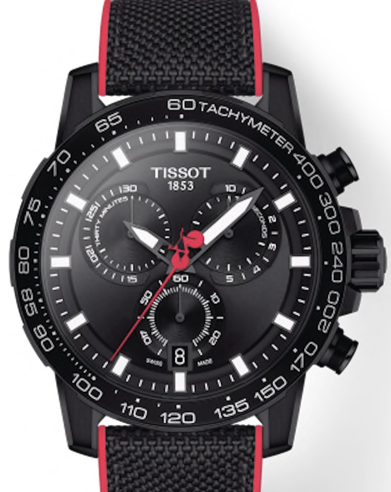 Proposto con cassa in acciaio 316L ø 45,50 trattata PVD nero e lunetta in alluminio, il Chrono SuperSport XL ha due cinturini, in pelle o tessuto e gomma, il movimento è al quarzo svizzero, sul quadrante nero la sagoma di un ciclista é il contrappeso della lancetta cronografica e lo stesso disegno stilizzato appare sul fondello.