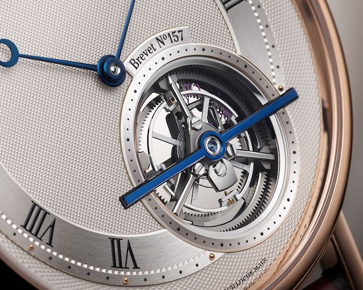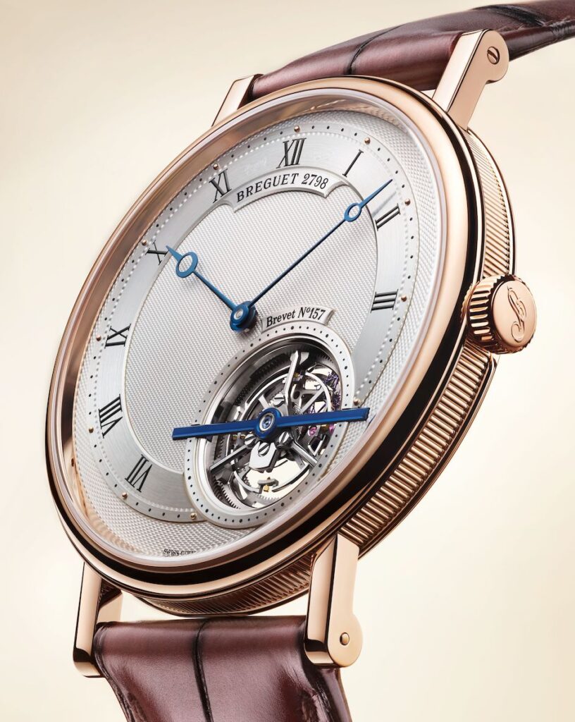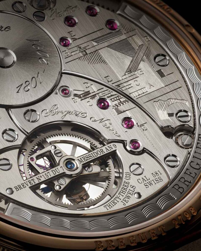 Sul bariletto infatti è incisa la frase «Anniversaire 1801 – 2021», il ricordo del numero e della data del brevetto «Brevet N°157 Du 7 Messidor An IX» è inciso sul ponte inferiore del Tourbillon, a lato del numero individuale di ogni orologio Breguet. Tutte le incisioni compresa la firma «Breguet» sulla massa oscillante periferica, sono fatte a mano; infine sul lato destro del movimento è stata incisa la riproduzione dell’acquarello su tavola che Breguet depositò nel 1801 insieme alla sua domanda di brevetto per il regolatore Tourbillon. Completiamo con altre indicazioni tecniche: il diametro della cassa in oro rosa (41 mm) con la tradizionale carrure scanalata; il quadrante in oro 18 carati è diviso in quattro sezioni lavorate a Clous de Paris e Grain d’orge, il giro delle ore argentato ha numeri romani, le lancette a pera sono in acciaio azzurrato, sull’asse del Tourbillon sono indicati i piccoli secondi. Il movimento è il Calibro 581, 16 linee, 33 rubini, A/h 28.800, riserva di carica di 80 ore, il bariletto è su rullini con cuscinetti a sfere, lo scappamento è ad àncora di lato invertito con corna in silicio e anche la spirale è in silicio.
