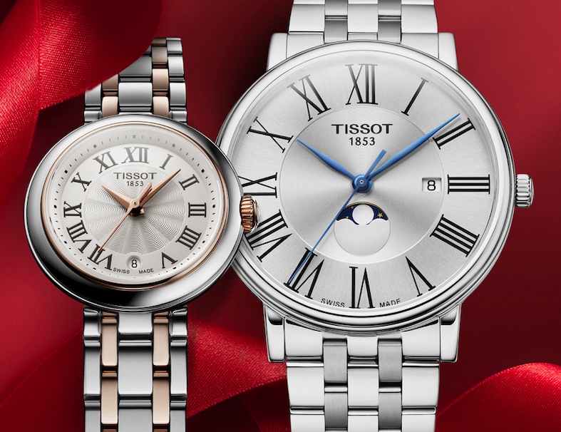 TISSOT ha pensato a un doppio regalo con orologi non esclusivamente legati al 14 Febbraio. Per lei suggerisce Bellissima, ø 26 mm, per lui il Carson Gent Premium Moonphasae ø 40 mm, entrambi in acciaio com bracciale analogo a cinque maglie, che, per lei, ha quelle centrali trattate PVD oro rosa, un’altro particolare femminile è il cabochon in ceramica bianca sulla corona; movimento svizzero al quarzo.
