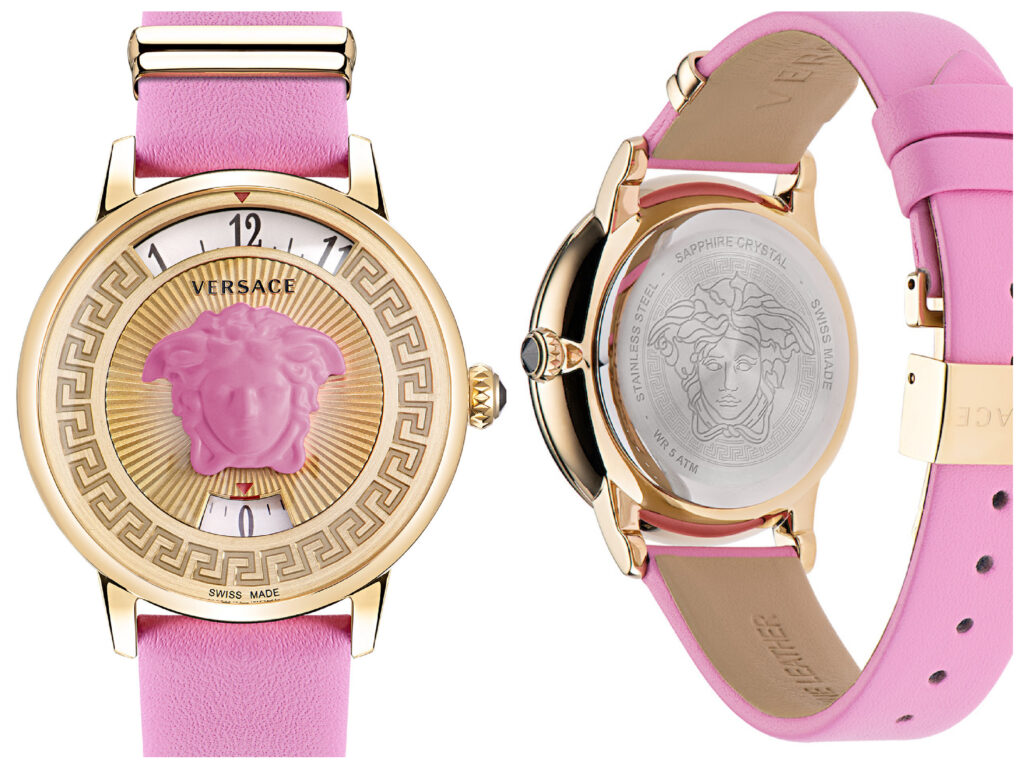 VERSACE Nelle numerose collezioni che sono state preparate per la primavera e l’estate 2022 non poteva mancarne una deliziosamente femminile, perfetta per San Valentino con l’iconico motivo della greca e la Medusa in 3D, racchiusa tra due vetri sul quadrante (che mostra ora e data) e incisa sul fondello, sulla corona lo zaffiro; la cassa ø 38 mm è trattata IP champagne, il movimento al quarzo svizzero, è il à Calibro Ronda 762.2; volendo, proprio per esagerare… si può abbinarlo all’analoga piccola borsetta.