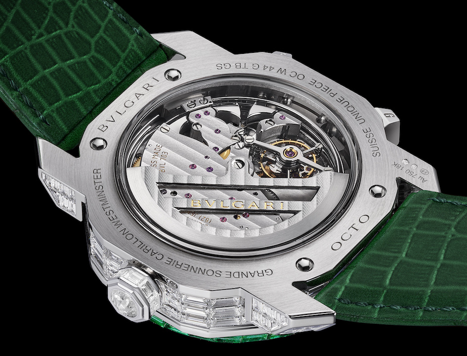 Scelta gioiello con 446 smeraldi dello Zambia e diamanti taglio baguette, per un totale di oltre 30 carati, per l’Octo Roma Emerald Grande Sonnerie (una precedente versione era in diamanti), che tecnicamente è l’orologio più complesso realizzato da Bulgari. Il movimento è il calibro BVL703 a carica automatica con tourbillon; suoneria Westminster a 4 martelli, ripetizione minuti e indicatore della riserva di carica per il meccanismo a suoneria: 24 ore in modalità Grande Sonnerie, 28 ore in modalità Petite Sonnerie; A/h 21.600, rubini 82, diametro 31.50 mm, spessore 8.77 mm; i suoi 732 elementi sono assemblati in nove mesi da un unico mastro orologiaio. Questo pezzo unico ha la cassa in oro bianco ø 44 mm con fondello in vetro zaffiro e lunetta in smeraldi.