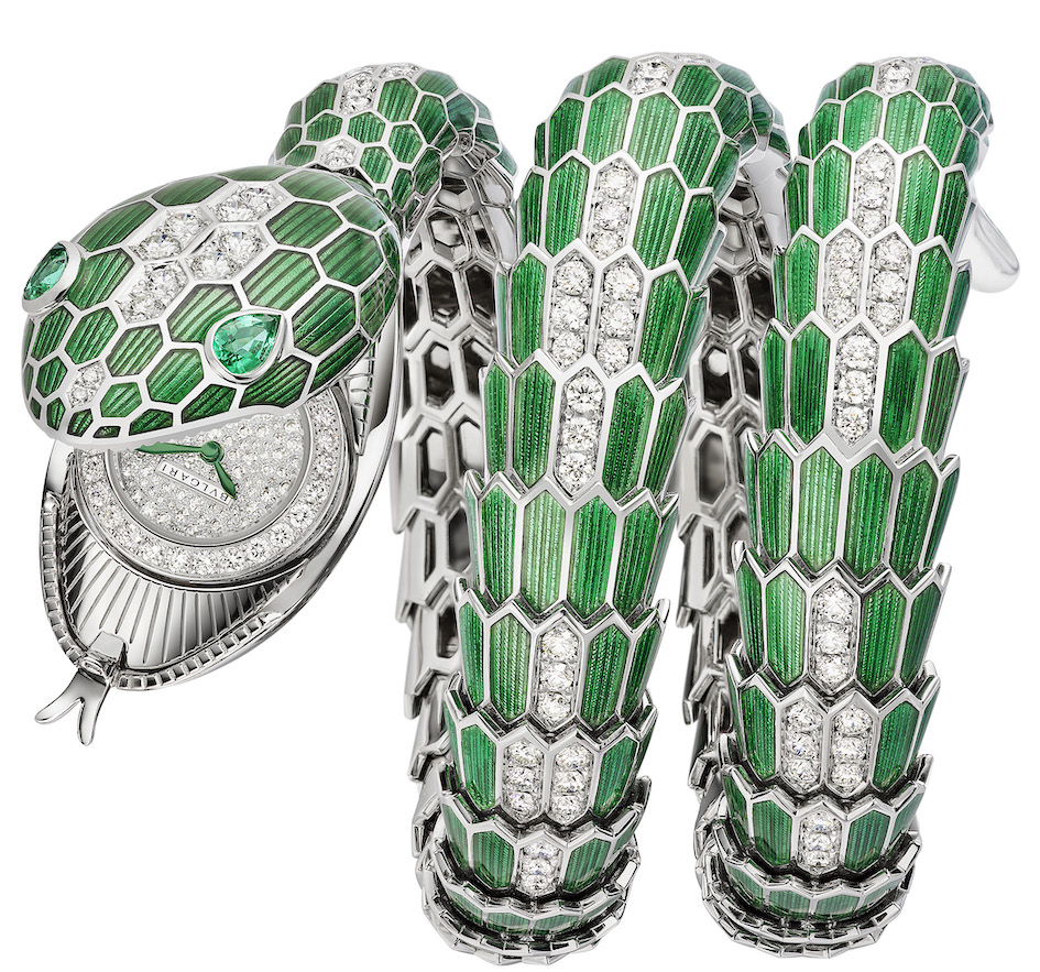 Toccando la lingua del serpente si apre la testa (cioè la cassa) e si vede l’orologio segreto; la cassa, ø 40 mm è in oro rosa laccato nero con gli occhi in diamanti taglio a pera o oro bianco laccato verde, occhi in smeraldi tagli a pera; in entrambi i casi il quadrante è con diamanti a pavé e il bracciale ha un doppio giro; un’altra versione vede l’oro rosa con inserti in turchesi e gli occhi in rubelliti e un’altra ancora ha la testa in oro bianco, il bracciale in oro giallo e la coda in oro bianco; a seconda delle referenze varia il numero delle pietre preziose.