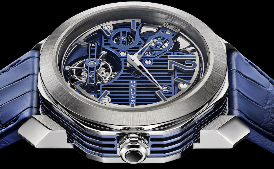 Nell’Octo Roma Blue Carillon Tourbillon, la cassa è stata riprogettata per amplificare la resa e la nitidezza del suono. Il movimento ripetizione minuti con tre martelli, è il calibro BVL428 a carica manuale, prodotto in house, ø 35 mm spessore 8.35 mm di spessore, 432 i componenti, 75 ore di riserva di carica, 21.600 A/h, 36 rubini, movimento e ponti trattati in blu. Il posizionamento dei gong direttamente sulla cassa in titanio, ø 44 mm, ha migliorato la propagazione del suono, il fondo è in vetro zaffiro. Martelli, gong, gabbia del tourbillon e superfici perforate alternano l’acciaio lucido, platina e ponti sono trattati con ALD, rivestimento ultra-tecnologico a base di carbonio, ottenuto attraverso un processo di deposizione sottovuoto, che si presenta in un elegante blu. Trenta gli esemplari.