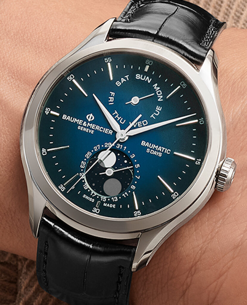 Il modello moon-date, in acciaio ø 42 mm con fondo in vetro zaffiro, offre un quadrante blu sfumato laccato, quasi un cielo stellato, protetto da un vetro zaffiro grigio sul quale alle 12 si leggono i giorni della settimana e alle 6 la data che incornicia il disco della luna su fondo nero, indici a trapezio rivettati e rodiati. Il Calibro BM-14, ha 5 gg di carica; cinturino intercambiabile in alligatore nero con impunture nere sopra e blu sotto.