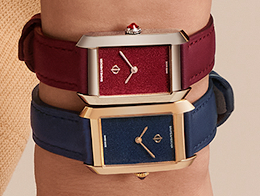 In quanto agli Hampton, lanciati nel 1994 in stile Art Dècò, queste le due nuove versioni destinate al pubblico femminile; una bordeaux in acciaio lucido e una blu in oro (cassa mm 35 x 22,2 cm e 6,9 mm di spessore), sul quadrante paillettato ispirato alle pietre di avventurina, il logo Phi, simbolo di perfezione, lancette a gladio e sulla corona uno spinello nel colore del quadrante, cinturino in vitello di colore analogo e facilmente cambiabile con altri colori. Il movimento al quarzo di nuova generazione indica ore e minuti, l’autonomia è di otto anni.