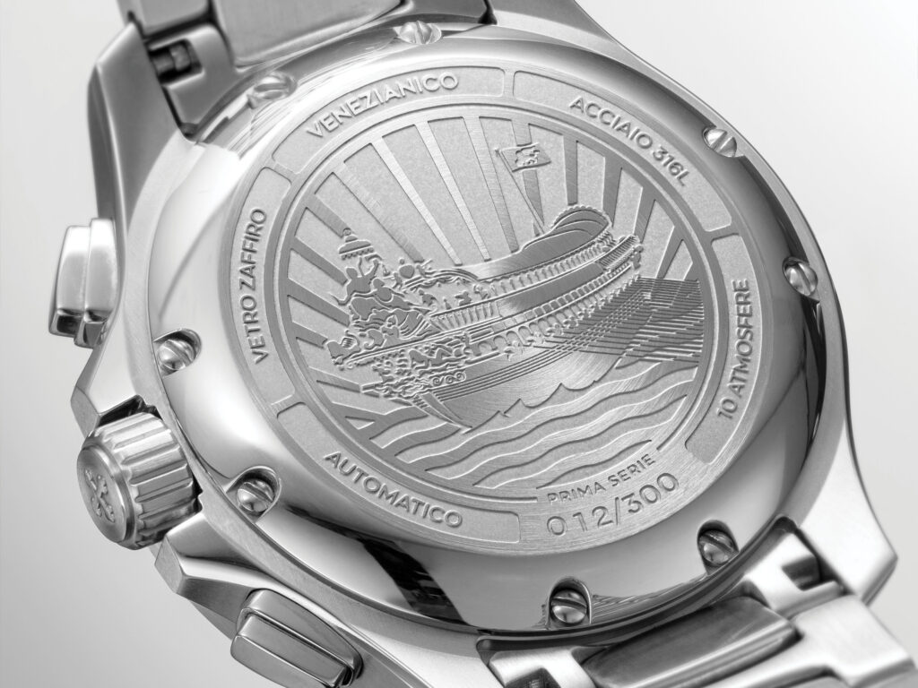 Il primo cronografo di Venezianico ha il nome dell’imbarcazione dogale, la cui sagoma è incisa sul fondello di acciaio.