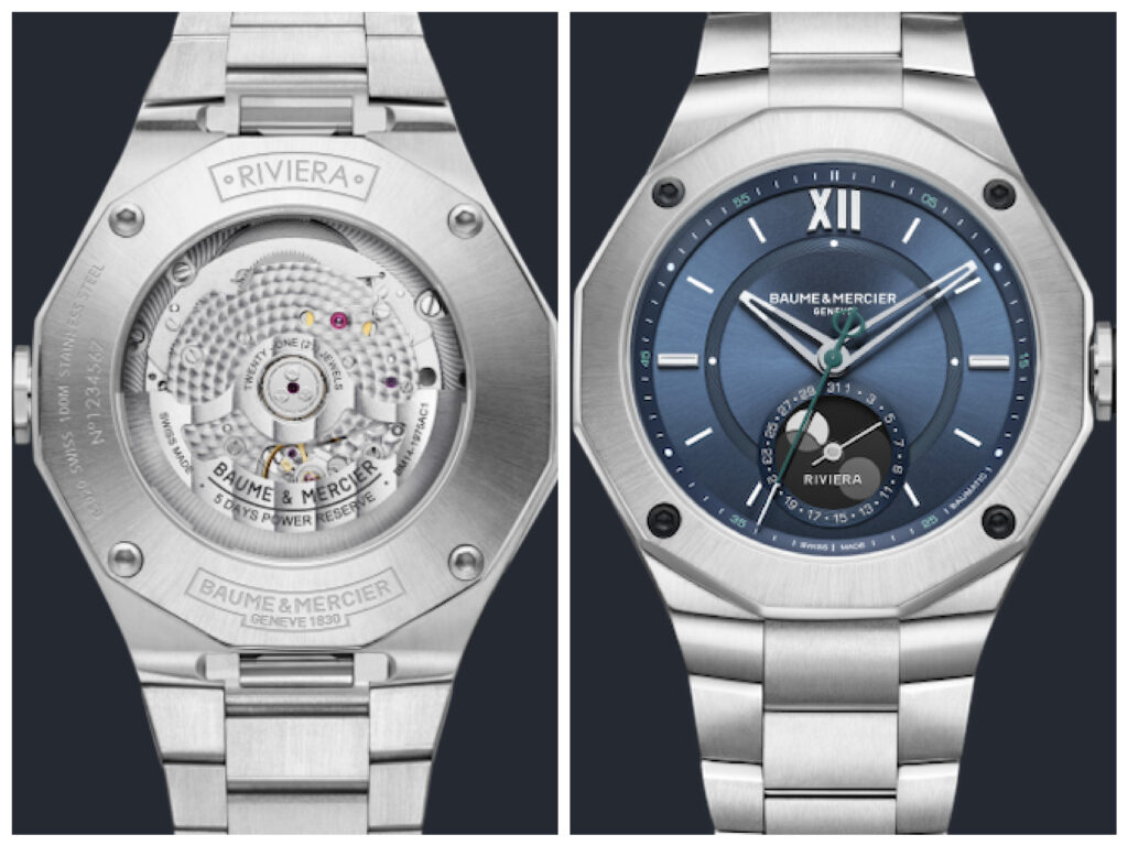 Two version of new steel case Riviera with moon, one with bracelet and te other with strap, for both selfwinding movement Baumatic.