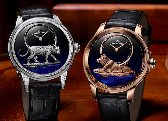 Quale miglior momento poteva essere scelto se non il 2022 con l’anno della Tigre e il 31 gennaio Jaquet-Droz ha presentato tre coppie di orologi omaggio allo zodiaco cinese. Sopra la Ref.1032834270, Automaton Tiger Opal dove sul quadrante in onice la belva, realizzata in oro su un letto di foglie, forse dorme oppure guarda una carpa che nuota nel mare azzurro dell’opale australiano, mentre nel secondo orologio la belva è in piedi, pronta all’attacco, non certo della carpa, ma di qualche nemico celato nel bosco.