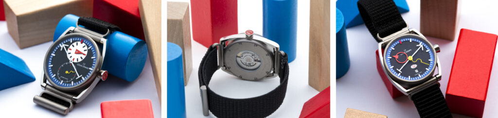 Esteticamente la cassa, w.r. a m. 100, in titanio grado 5, presenta accentuati brancard in titanio grado 2 e una corona conica, le superfici diverse creano contrasti di luce, fondi a vista sul quale spicca il logo Stephen Silver ; il cinturino è in nylon. Cromaticamente le scelte iconiche di Silberstein riguardano il quadrante dove si inseguono colori diversi, bello l’iridescente blu zaffiro della minuteria, ispirato dalle gemme del gioielliere americano. Sul Régulateur larghe lancette per le ore e colorate per minuti e secondi, sull’altro modello una visione completa dei giorni della settimana su diversi fondi colorati (lunedì grigio, domenica in giallo brillante). il movimento automatico è svizzero.