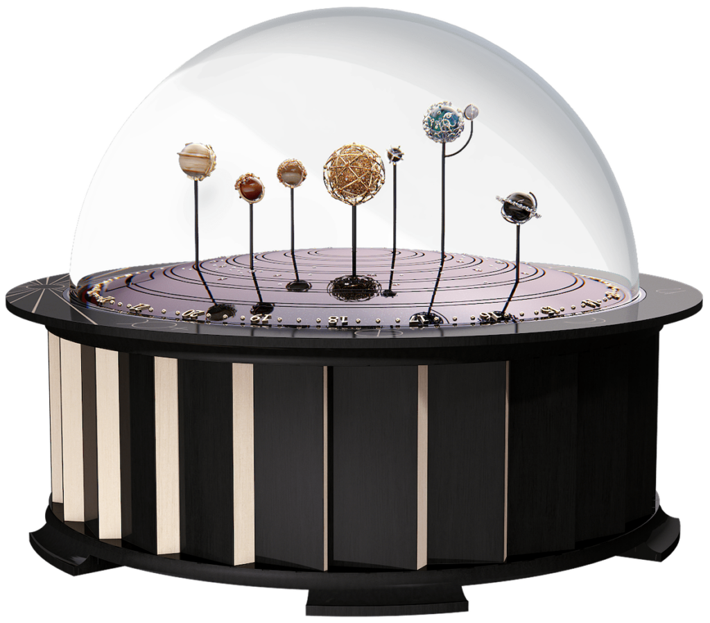 ottone, PVD nero e blu, pelle di capra. Sotto il profilo orologiero ha movimenti automatici e meccanici tra i quali un planetario e altri 11 moduli per vedere ore/minuti, il calendario perpetuo; la riserva di carica di 15 giorni, l’animazione è a richiesta; la melodia che accompagna il movimento dei pianeti è stata creata appositamente grazie a una boîte à musique e a un carillon con campane e martelli Questi i materiali dei pianeti: Mercurio: oro bianco, zaffiri, diamanti, pietra di luna; Venere: oro rosa, zaffiri viola e gialli, agata; Terra: oro bianco, smeraldi, tormaline Paraíba, granati tsavorite, crisocolla; Marte: oro rosa, zaffiri rosa, diamanti, corniola;