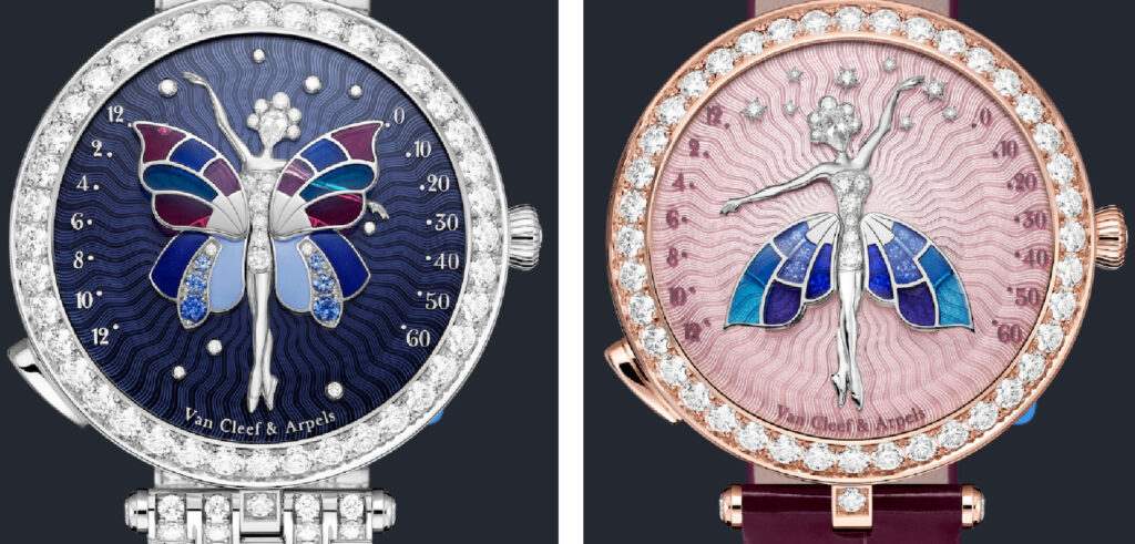 Nato nel 2013 il Lady Arpels Ballerine Enchantée è in due nuove versioni. A sx in oro bianco e diamanti con bracciale analogo, un vero orologio gioiello, a destra in oro rosa, ø 40 mm; quadranti in oro bianco, zaffiri e diamanti su smalto champlevé e plique-à-jour; in oro bianco e smalto plique-à-jour, cinturino in alligatore viola; per entrambi movimento automatico dotato di un modulo retrogrado e ora a richiesta.