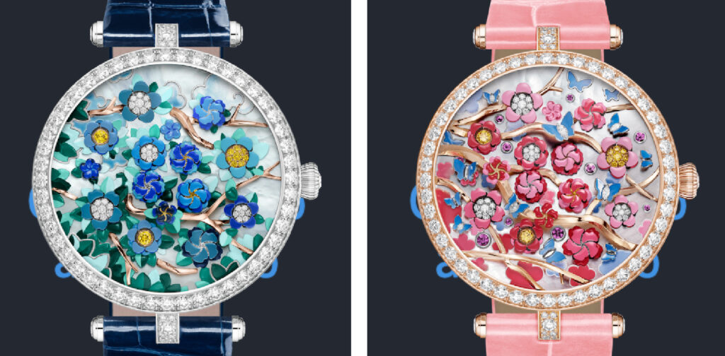 Due i modelli della linea Florales nella collezione Complications Poétiques, a dx la versione Cerisier, per entrambi cassa ø 38 mm in oro e diamanti; quadranti in oro bianco, oro rosa, oro giallo, diamanti gialli e bianchi, madreperla bianca, pittura miniaturizzata; movimento automatico, dotato di un modulo di apertura dei fiori per le ore e visualizzazione laterale dei minuti, cinturino in alligatore lucido.