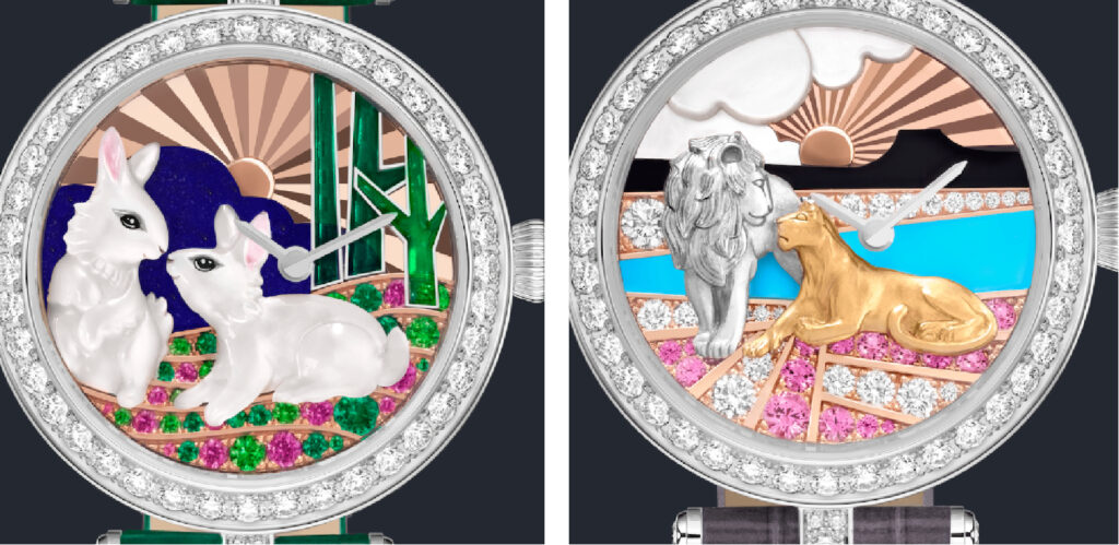 Cadrans Extraordinaires fanno di questa collezione delle vere opere d’arte con scene in rilievo dalla grande prospettiva; qui una coppia di coniglietti e due leoni realizzati da incisori, tagliatori, incastonatori e smaltatori. I Lady Duo hanno la cassa in oro bianco e diamanti anche su carrure e anse, ø 33 mm, quadranti, a sx in oro bianco e rosa, zaffiri rosa, smeraldi, granati, tsavorite, lapislazzuli, madreperla bianca, smalto plique-à-jour, pittura miniaturizzata e, a dx, in oro rosa bianco e giallo, zaffiri rosa, diamanti, turchese, onice, madreperla bianca. Movimenti a carica manuale