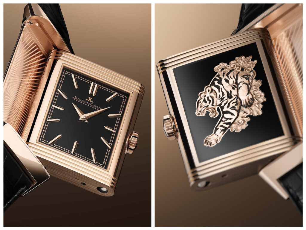 Sul fondello della cassa in oro rosa lo sfondo in smalto Grand Feu nero opaco, accentua la maestosità della tigre policroma, ideata dai Maestri artigiani di Le Sentier. L’opera è sta eseguita con la tecnica dell’incisione modellata, che vede l’impiego di diversi bulini per dare profondità al disegno sulla superficie già smaltata con un impegno di almeno 55 ore. Il quadrante ha lo stesso smalto Grand Feu e il movimento è il Calibro 822A/2 JLC a carica manuale. È un pezzo eccezionale, realizzato solo su ordinazione.