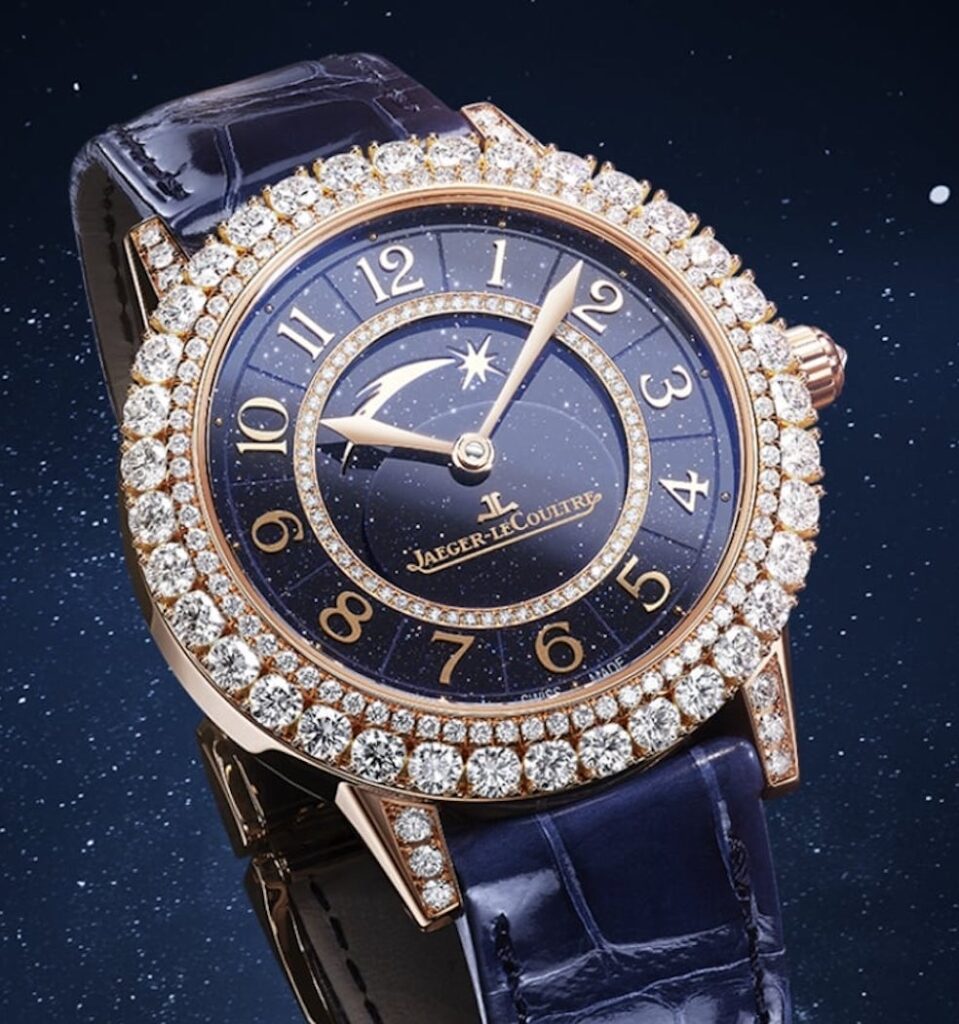 Per i polsi femminili, nella collezione Rendez-Vous, le versioni Rendez-Vous Star e Rendez-Vous Dazzling Star, introducono quasi un discorso tra le fortunate proprietarie di questo JLC e il cielo, dove il movimento automatico Calibro 734 JLC comprende un disco in titanio, in colori coordinati a quelli dei quadranti, che ruota ad ogni movimento del polso, facendo apparire sei o più volte nell’arco di un’ora, una stella cadente (grazie alla corona infatti si può ripetere l’apparizione di quella che, con una lunga scia di luminosi frammenti, sembra una stella cometa, le stelle cadenti si muovono ad una velocità incredibile, mentre la stella cometa, secondo la tradizione resta a lungo nel cielo). La cassa ø 36 mm, spessore mm 11,6, è in oro bianco con quadrante blu o in oro rosa con quadrante in un delicato marrone dorato, entrambi laccati più volte e con la luna e le nuvole dipinte a mano. Cassa, anse e lunetta sono incastonate con diamanti, che nella versione più semplice sono 181, mentre arrivano a 617 in quella Dazzling. Gli indici applicati e le lancette sono in stile Floreale.
