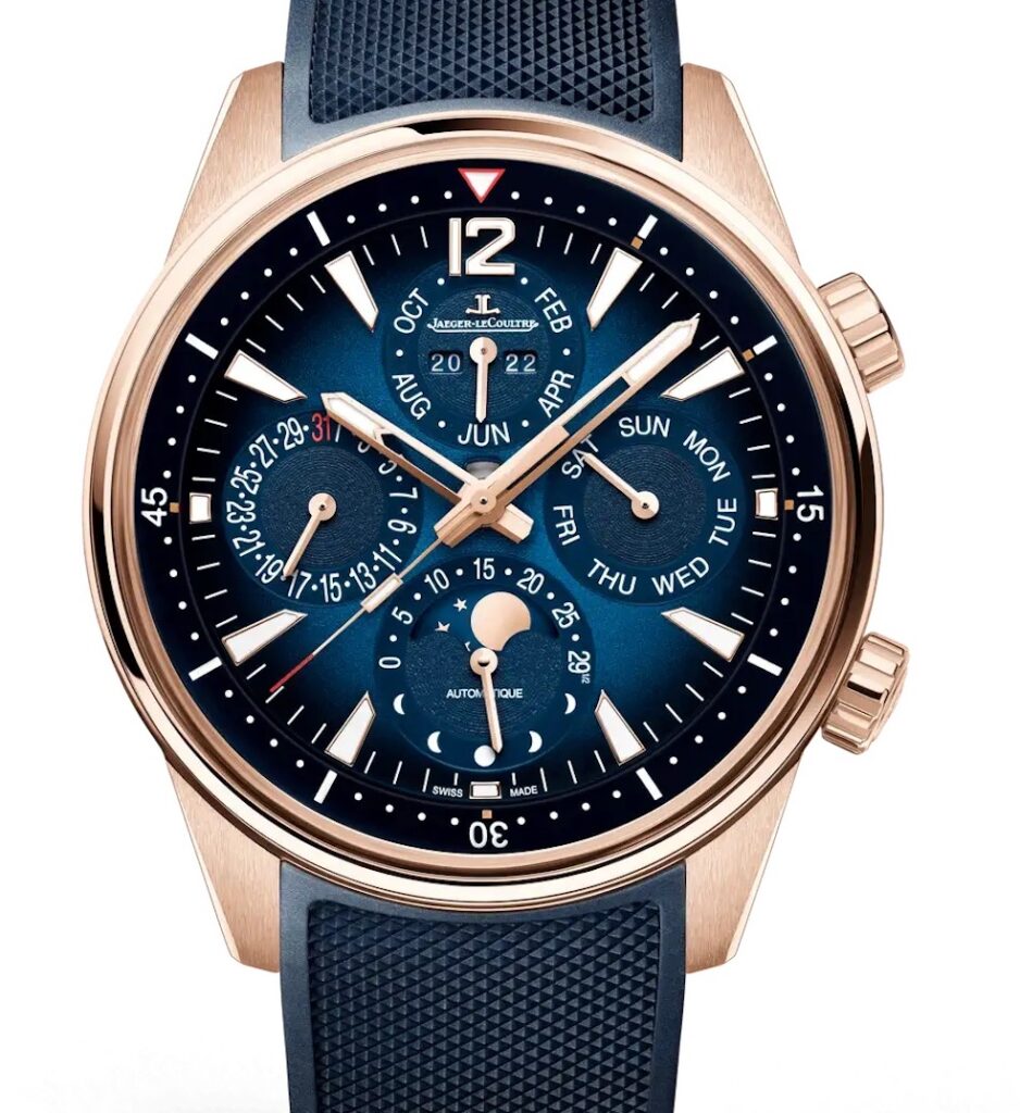 Dal fondo della cassa in oro rosa ø 42 mm spessore 11,97, w.r.a 10 bar, si ammira il nuovo Calibro JLC 868 automatico, A/h 28.800, rubini 54, un solo bariletto, carica 70 h, progettato, prodotto e assemblato nella Manifattura: i componenti sono 351, tra le novità l’indicatore delle fasi lunari in entrambi gli emisferi, con lancetta retrograda per l’emisfero australe. Il quadrante laccato blu grené ricorda perfettamente la volta celeste. Due i cinturini facilmente intercambiabili, in caucciù blu o in alligatore nero con fibbia déployante.