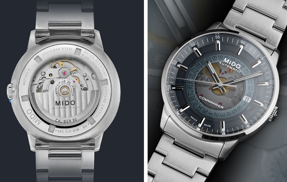 Il Commander Chronograph, nato alla fine degli anni ’50 torna in una edizione speciale con la cassa in acciaio, ø 42,5 mm, w.r. a 5 Bar, trattata color oro rosa con analoga sottile elegante lunetta che incornicia un quadrante grigio scuro lavorato a raggi di sole; anche in questo modello non mancano riferimenti architettonici, addirittura la Torre Eiffel per gli indici slanciati; il movimento automatico è il Calibro 60 (su base ETA A05H21), 13¼’’’, ø 30.00 mm, spessore: 7.90 mm, 25 rubini, 28,800 A/h, carica di 60 h, elegantemente decorato con viti azzurrate e massa oscillante con strisce di Ginevra e logo Mido.