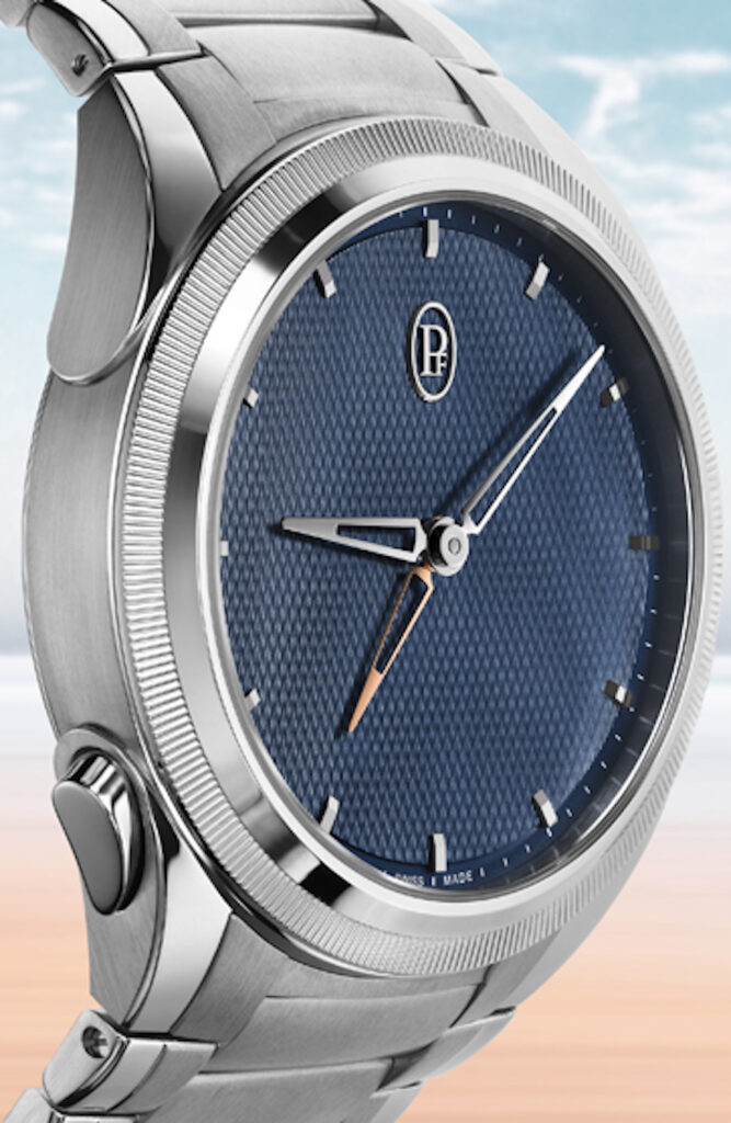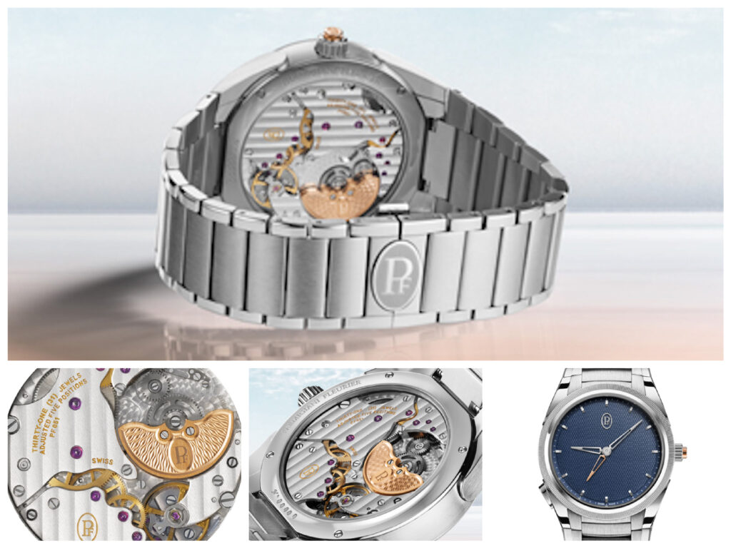 In acciaio, cassa ø 40 mm w.r.a m.60 e spessore 10,70 mm e con un bel quadrante guilloché grain d’orge, con colore definito Blu Milano, questo orologio, in prima mondiale, unisce il sistema della lancetta rattrapante dei cronografi a un GMT. Due e sovrapposte le lancette delle ore, una in oro rodiato per l’ora locale e una in oro rosa per l’ora di casa; premendo il pulsante a ore 8 la prima si sposta in avanti; quando il l’ora del secondo fuso non serve più premendo il pulsante in oro rosa sulla corona le due lancette si sovrappongono, quella rodiata sopra a quella in oro rosa.Il movimento, Calibro PF051 automatico, ha una riserva di carica di 48h, 31 rubini, spessore 4,93mm, A/h212.600, il microrotore in oro rosa è decorato a grain d’orge