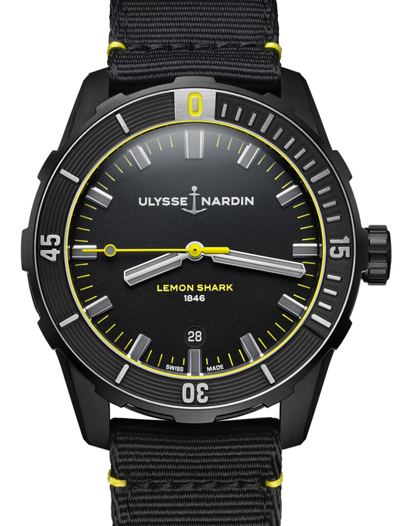 Eccoci agli Ulysse Nardin dei quali abbiamo già scritto il 17 Maggio 22 a proposito della prossima Ocean Race della quale la Marca elvetica è Official Time Keeper. Ma c’è anche un’edizione limitata a 300 esemplari, del Diver Lemon Shark, lo squalo limone del quale propone dettagli gialli come la sua pelle sul quadrante nero, mentre sul fondello della cassa ø 42 mm w.r.a m.300, appaiono le sagome di tre squali lemon; il cinturino R-Strap è realizzato con reti da pesca riciclate, il movimento automatico è il Calibro UN-816 che impiega elementi in silicio.
