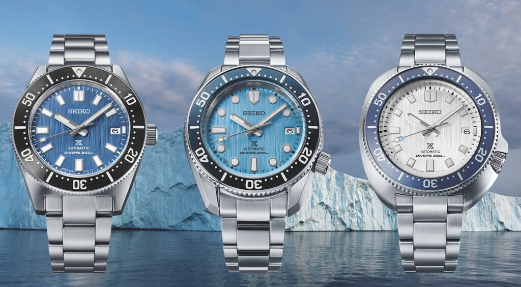 Facciamo un salto di target e passiamo ai Seiko della collezione Seiko Prospex Save the Ocean, nella foto sotto, Diver professionali che riprendono modelli del passato dedicati ai ghiacciai dell’Oceano; la cassa attuale in acciaio è w.r.a m. 200; il movimento è il Calibro 6R35 con una riserva di carica di 70 ore; parte del ricavato della vendita va a Enti di beneficienza marinari. Infine come dimenticare le due versioni dedicate alla salvaguardia dei pinguini che abbiamo presentato il 23 Maggio scorso?