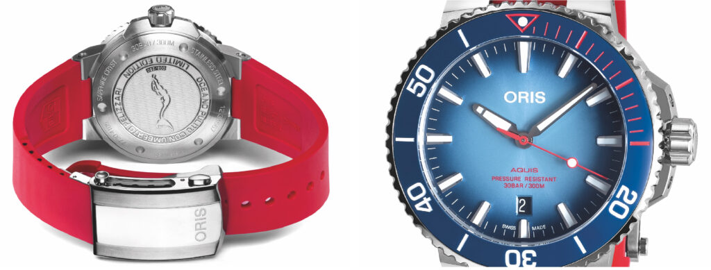 Concludiamo con il segnatempo della collezione Aquis Oceano Pulito, presentato ieri, che Oris ha voluto dedicare al suo ambassador, recordman mondiale, Umberto Pellizzari. La cassa in acciaio ø 43,50 mm w.r. a m.300, ha il fondello inciso e la numerazione dell’edizione limitata a 250 esemplari; il movimento automatico è il Calibro 733 (A/h 28.800, rubini 26, carica 38 h), il cinturino è in gomma rossa con fibbia pieghevole estensibile, nella confezione è inserito anche un bracciale in acciaio.