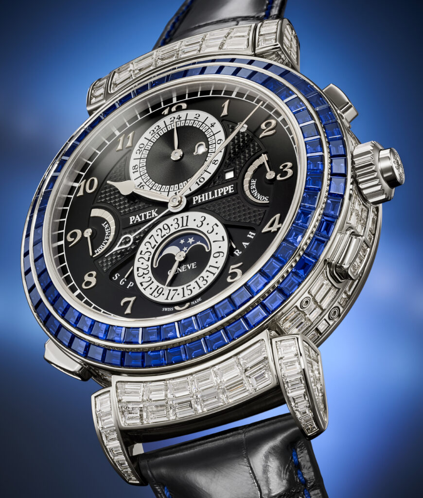 Premesso che gli orologi gioiello non sono tra i nostri preferiti, non possiamo non ammirare le nuove versioni del Cronografo Calendario Perpetuo Ref.5271/11P-010 e, ovviamente, la Ref.6300/401G-001, l’orologio da polso più complicato della Maison, con 20 funzioni (di cui cinque sonore) presentato nel 2016 e che, in questa nuova versione, sulla cassa double-face in oro bianco, incastona 409 diamanti a baguette (pari a 31 carati) oppure 118 zaffiri blu e 291 diamanti tutti a baguette.