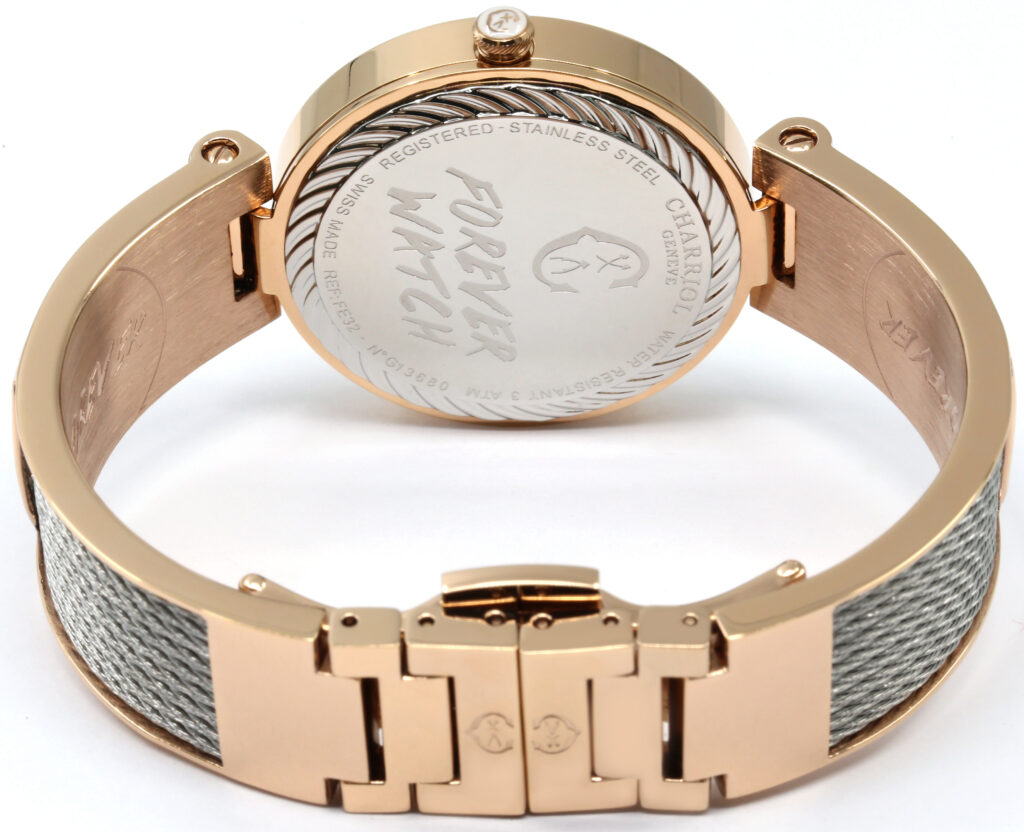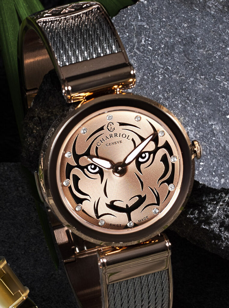 Sul quadrante in madreperla rosata, ravvivato dal disegno color tartaruga, spiccano gli indici in zirconi e a un occhio attento non sfugge che il bracciale è sempre quello realizzato in acciaio con le nove cime marinare attorcigliate, segno distintivo della maggioranza degli orologi Charriol. Sul fondello della collezione dedicata agli animali la frase Forever Watch; l’orologio infatti è stato presentato come Forever Tiger. Infine nelle collezioni Charriol dedicate agli animali, da ricordare gli orologi dedicati all’orso polare, alla tartaruga e all’elefante.