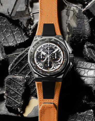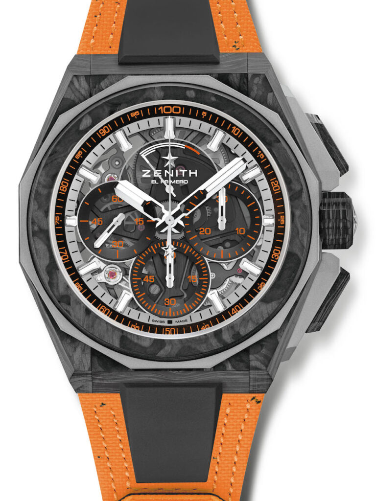 Il cronografo più amato della Maison elvetica, equipaggiato con il movimento automatico El Primerò 9004, scende nei fondali con una cassa ø 45 mm w.r.a m. 200 in carbonio e titanio microsabbiato, cinturino in velcro arancione, i colori dell’Island X Prix, realizzato con parti di pneumatici Continental riciclati (intercambiabile con gli altri in dotazione in velcro nero o caucciù nero con fibbia) e che sul fondo in vetro zaffiro ha il logo Island X Prix.
