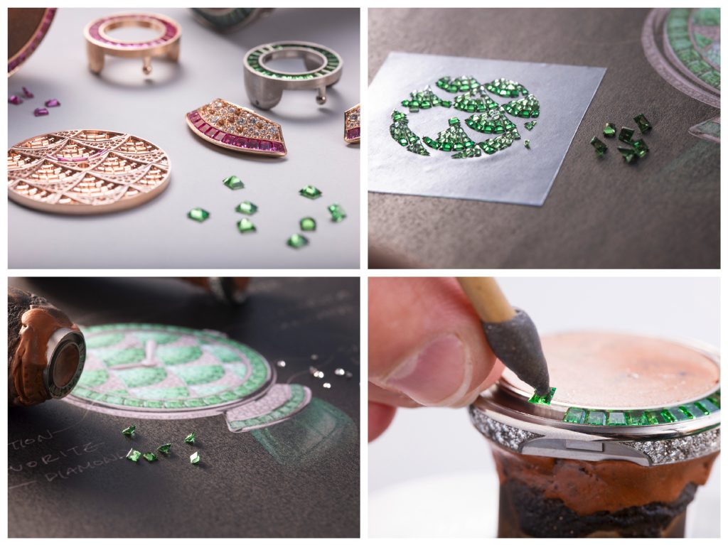 Le due versioni, Ref 103713 e Ref.103714, con cassa in oro ø 36 mm, hanno movimenti al quarzo, quadrante in madreperla e indici in diamanti, ma, al di là dell’aspetto orologiero, vanno ammirati per la fattura, un inno alla bellezza e alla creatività di stilisti e gioiellieri. Nel primo in oro rosa sono stati impiegati 32 brillanti e altrettanti zaffiri rosa, un cabochon di tormalina ovale; tre citrini taglio smeraldo cabochon, due rhodolite rosa a cuore ed ovale, due peridoti cabochon taglio smeraldo.
