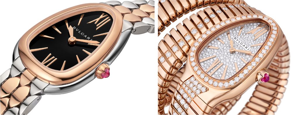 Dal modello più semplice in oro rosa e acciaio con la cassa mm 33, corona con un cabochon in rubellite, bracciale con maglie sagomate e quadrante nero laccato, sino a quello denominato Serpenti Infinity Tubogas per il sinuoso bracciale che si arrotola più volte intorno al polso, è un susseguirsi di proposte che ben raramente lasceranno indifferenti le signore e, prima di loro, i negozi dei gioiellieri locali (e non solo). L’Infiniy Ref.103791, ha la cassa in oro rosa di 35 mm, il bracciale d’oro cinge il polso una sola volta, i diamanti incastonati sono 131, nella Ref,103792 la cassa incastona 8 diamanti, sulla lunetta ne sono incastonati 44 con taglio brillante mentre quelli sul quadrante sono 242, il bracciale ne conta 172 e sulla corona splende un rubellite cabochon.Tutte queste versioni montano un movimento ad alta precisione al quarzo.