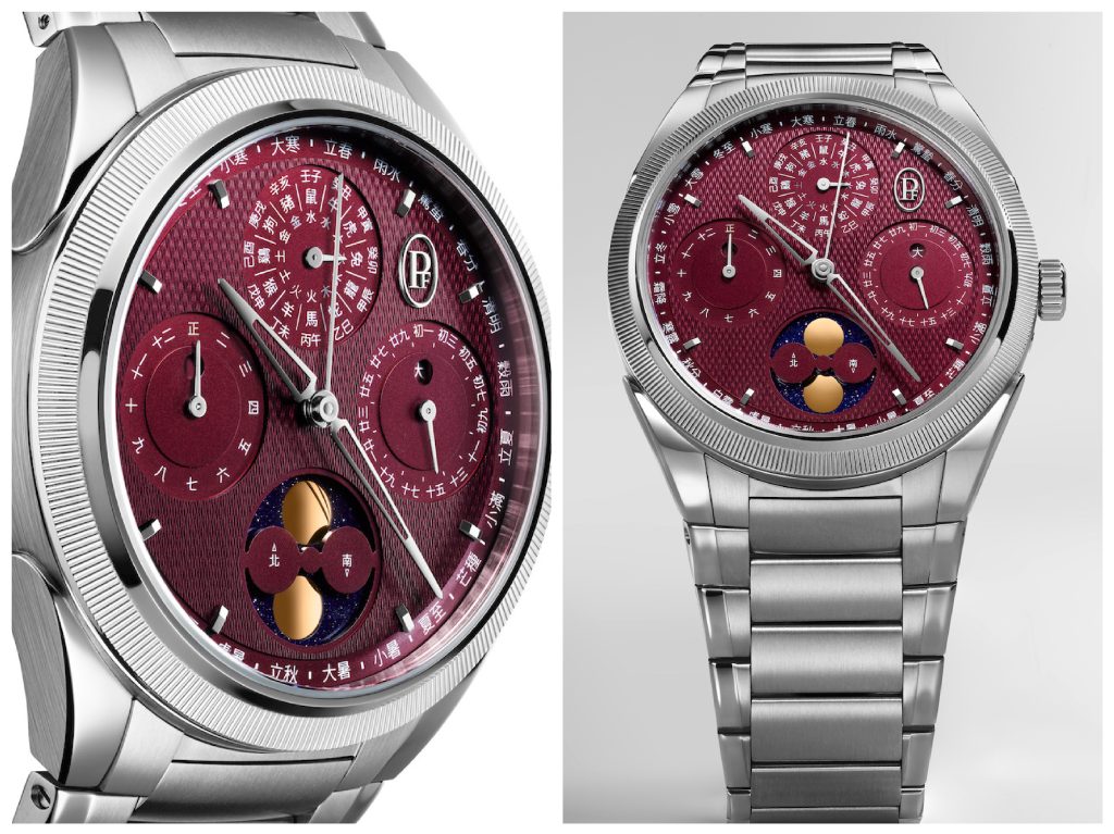 Il nuovo movimento è il Calibro PF008, che mostra sul quadrante le informazioni nei classici caratteri cinesi; le A/h sono 28.800, la carica arriva a 54 h, i rubini sono 42 e la massa oscillante scheletrata è in oro rosa 22 carati; le fasi di luna sono indicate su un cielo in avventurina blu; a ciò si aggiunge un’accurata decorazione a Côtes de Genève e con ponti smussati. Inoltre, dato che il calendario cinese non è ciclico, la complicazione è programmata meccanicamente per un periodo di 12 anni, al termine, l’orologio deve essere resettato per un nuovo periodo equivalente; il tutto se l’orologio continua a funzionare perché se si fermasse bisogna ricorrere ai correttori.